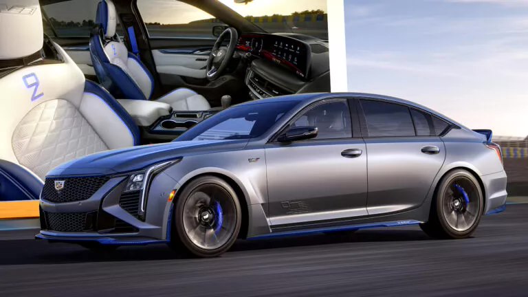 第一款是2025年款CT4-V Blackwing Petit Pataud,纪念1950年的凯迪拉克“Petit Pataud”赛车75周年。这款特别版车型搭载一台3.6升双涡轮增压V6发动机,可产生479马力和603牛·米扭矩。0-96公里/小时的加速时间为4.1秒,最高时速可达304公里/小时。CT4-V Blackwing Petit Pataud还采用独特的 Magnus哑光外观涂装,并辅以Stormhawk蓝色调的碳纤维部件。