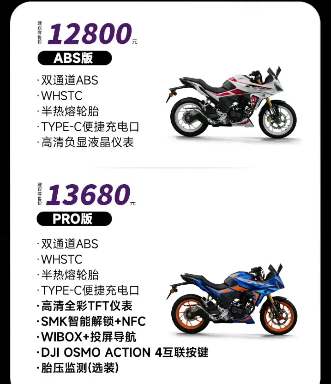 该车装备了全车LED光源、分体式手把、5英寸彩色液晶仪表、车机投屏等功能。官方信息显示,ABS版车型具备可调扭矩控制系统、双通道ABS+TCS牵引力控制系统等高级功能;PRO版则增加了全车LED光源、滑动离合、危险报警闪光灯等配置。