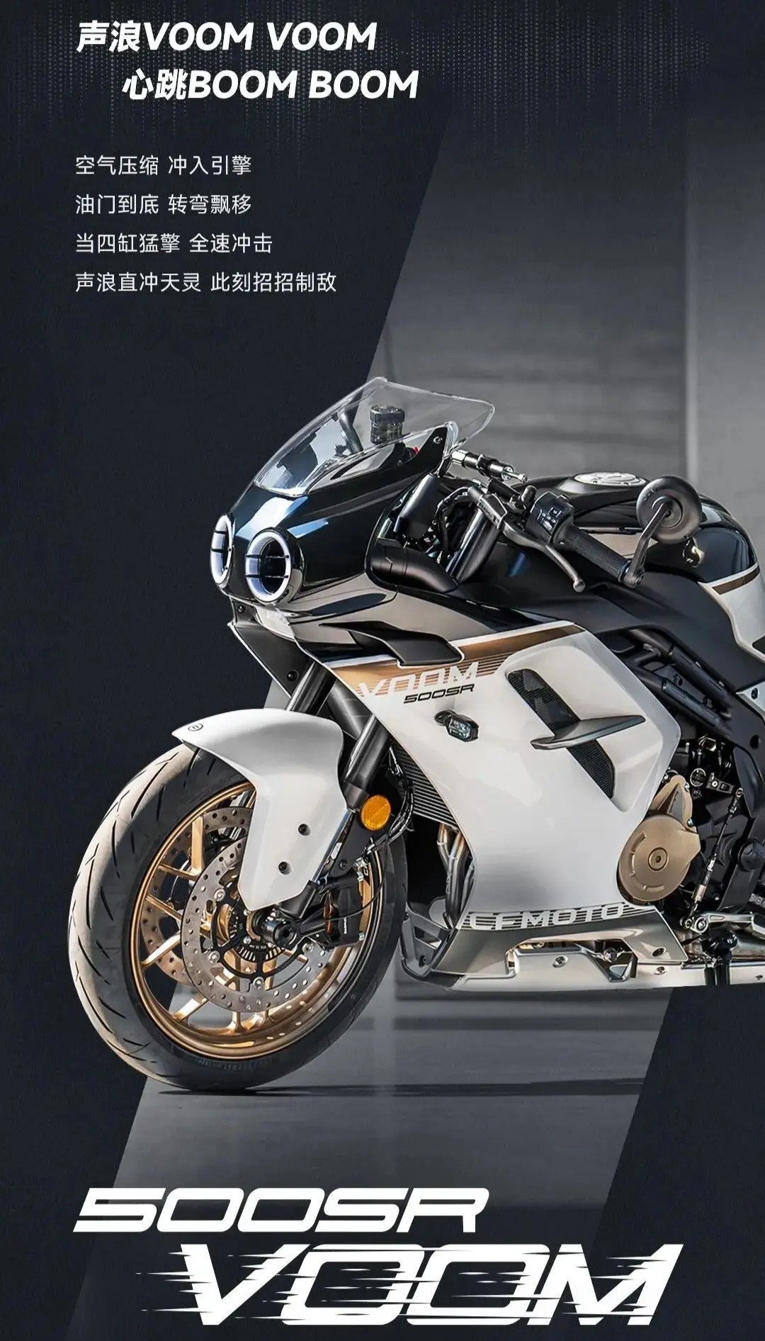 春风动力公布了其新款500SR VOOM摩托车的详细信息。这款四缸发动机的摩托车,最大功率达到58kW,转速可达到15700rpm+。该车的转矩输出为49N●m,功重比达到0.3。其最高时速可达220km/h,并采用“冰梯级光滑度”进气口设计来实现俯冲进气道效果。同时,这款车还采用了自主设计,对弹簧、气门、曲轴和凸轮轴进行了计算和调整,以实现配气系统算法,官方表示这将带来更高的燃油效率。