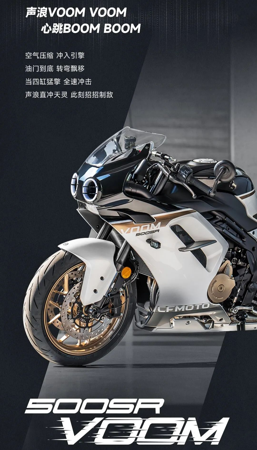 春风动力今日发布了500SR VOOM摩托车的详细信息。这款车型搭载了四缸发动机,最大功率为58kW,转速达到15700rpm+时可输出61kW的峰值功率。此外,500SR VOOM的扭矩为49N·m,功重比达到0.3。