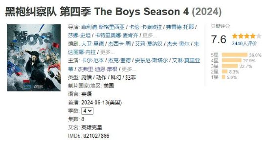 《黑袍纠察队》第四季在豆瓣网站上的评分已经出炉,目前为7.6分。该剧开播以来,已有超过3400人进行了评价。根据数据统计显示,有36%的观众给出了五星好评,而27.9%的观众给出了四星好评。
