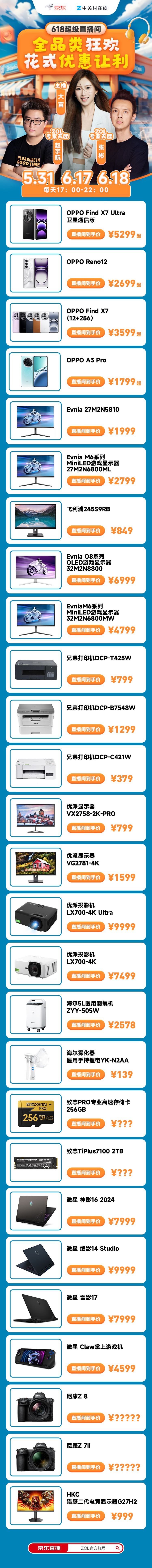 本次”超级直播间“,ZOL专家天团携美女主播一起多维度解读产品性能,将为小伙伴们带来618期间备受关注的数码电子产品,包括门锁、笔记本、手机、存储、显示器、主板、电视、打印机、投影机、相机等众多好物,直播大促只等你来。
