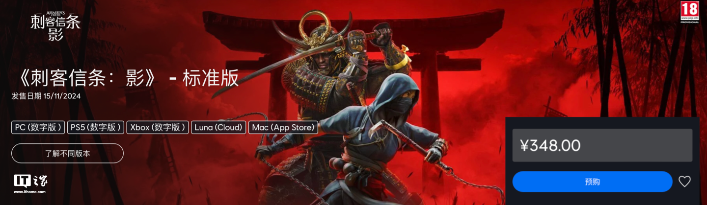 育碧的《刺客信条:影》将于11月15日正式发售。这款游戏将在PS5、Xbox Series X|S和PC平台上推出,并已在育碧商店预购,售价如下: