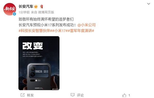 长安汽车表示:“致敬所有始终满怀希望的追梦者们,长安汽车预祝小米17系列发布成功!”