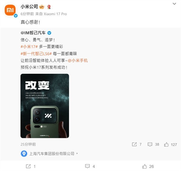智己汽车表示:“信心、勇气、追梦!小米17多一面更精彩......”