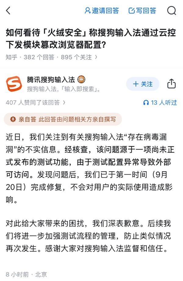 9月26日消息,日前,腾讯搜狗输入法知乎官方账号发文称,近日,我们关注到有关搜狗输入法“存在病毒漏洞”的不实信息。