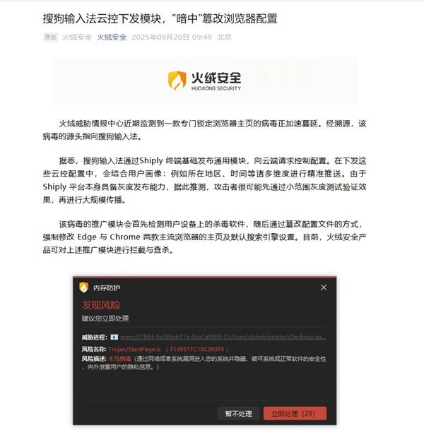据了解,9月20日,火绒安全在微信公众号发布一篇标题为《搜狗输入法云控下发模块,“暗中”篡改浏览器配置》的文章中称,火绒威胁情报中心近期监测到一款专门锁定浏览器主页的病毒正加速蔓延。经溯源,该病毒的源头指向搜狗输入法。