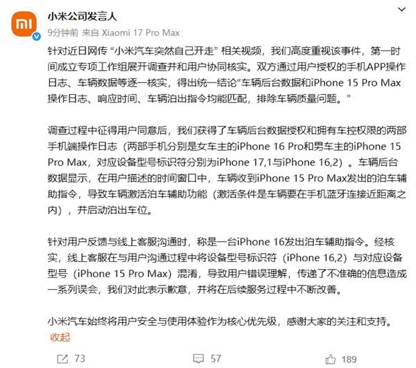 针对近日网传 “小米汽车突然自己开走” 相关视频,我们高度重视该事件,第一时间成立专项工作组展开调查并和用户协同核实。