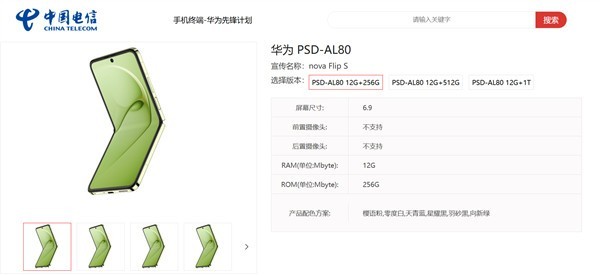 至于华为nova Flip S,该机今年9月已在中国电信终端产品库现身,拥有樱语粉、零度白、天青蓝、星耀黑、羽砂黑、向新绿六款配色,提供12GB+256GB、12GB+512GB、12GB+1TB三种存储规格。