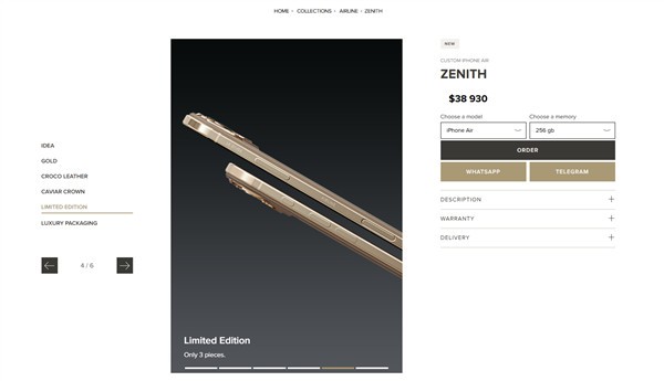 据了解,最贵的版本为iPhone Air Zenith,限量3台,机身顶部和中框均为黄金打造,后盖为黑色鳄鱼皮,镜头Deco还有18K金Caviar王冠Logo。