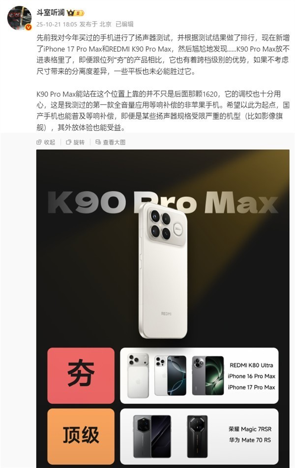 专业音频博主斗室听澜测试之后给出了最强排名,同时还表示:“REDMI K90 Pro Max能站在这个位置上靠的并不只是后面那颗1620,它的调校也十分用心,这是我测过的第一款全音量应用等响补偿的非苹果手机。”