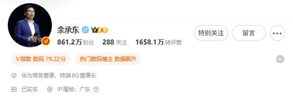 截稿前,余承东微博认证还没有加上新头衔。