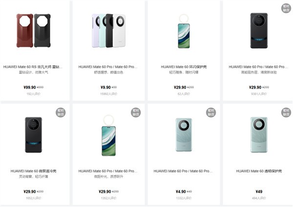 华为商城显示,原价99元的官方保护壳现在只要9.9元就能买到,原价999元的Mate 60 RS非凡大师星钻保护壳优惠后也仅需99.9元。