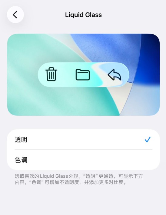 其中最重要的就是新增液态玻璃透明度调节,苹果在来回调整了几次液态玻璃效果之后,终于决定把选择权交给用户。