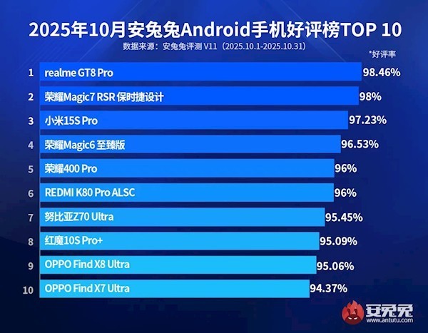 安兔兔最新公布了10月安卓手机好评榜,10月21日刚发售的realme GT8 Pro凭借98.46%的好评率强势登顶。