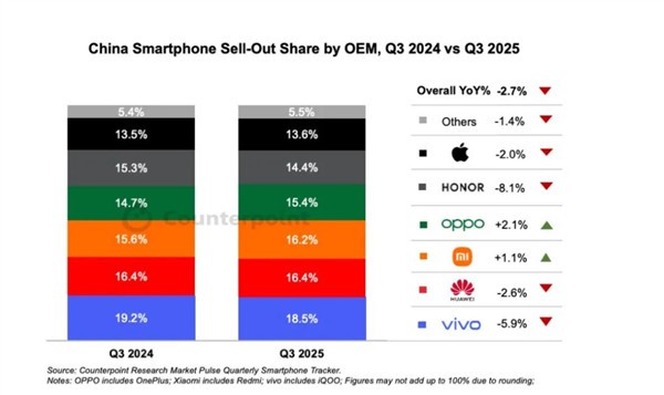 报告中指出,受经济增长放缓及需求降低的影响,2025年第三季度中国智能手机销量同比下降2.7%。