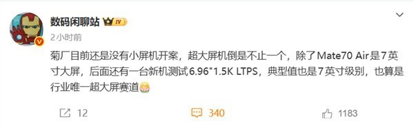 除了今天预售的华为Mate 70 Air是7英寸大屏外,后面还有一台新机测试6.96"1.5K LTPS 屏幕,典型值也是7英寸级别,算是行业唯一超大屏赛道。