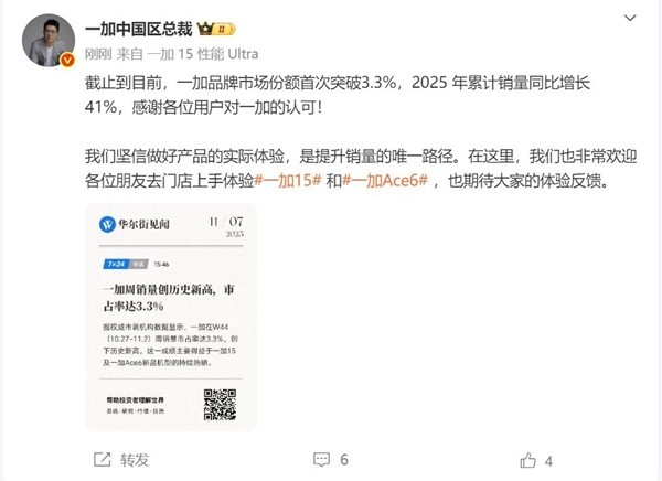 权威市调机构数据显示,一加在W44(10.27-11.2)周销量市占率达3.3%,创下历史新高,这一成绩主要得益于一加15及一加Ace6新品机型的持续热销。