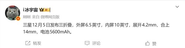 11月13日消息,博主i冰宇宙爆料,三星将在12月5日发布三折叠,外屏6.5英寸,内屏10英寸,展开4.2mm,合上14mm,电池5600mAh。