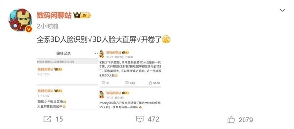 博主数码闲聊站爆料,华为Mate 80全系支持3D人脸识别,包括标准版,这在Mate系列史上还是第一次。