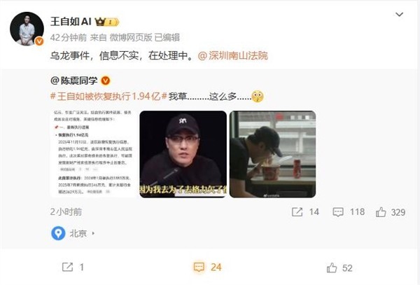 对此,王自如回应称:“乌龙事件,信息不实,在处理中。”同时@了深圳南山法院。