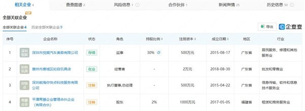 企查查显示,目前王自如名下关联4家企业,其中深圳市悦宸汽车美容有限公司和惠州市惠城区如自玩具店处于存续状态。