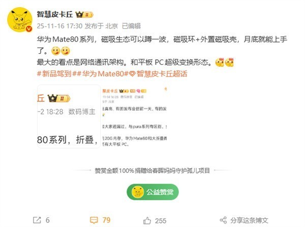与此同时,博主“智慧皮卡丘”也进一步确认,Mate 80系列支持磁吸环,兼容外置磁吸壳,最大看点是网络通讯架构。