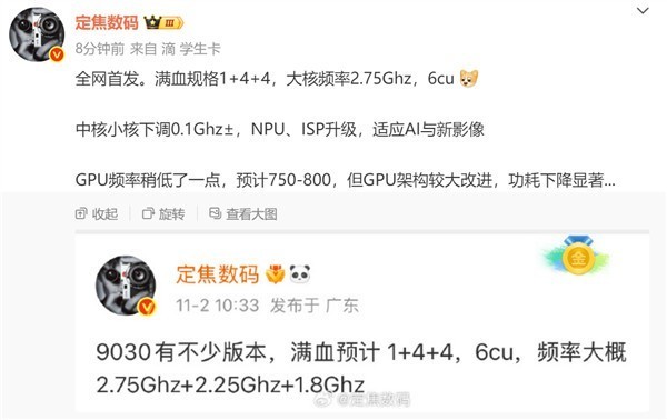 按照博主的说法,麒麟9030满血规格是“1+4+4”核心,大核频率2.75Ghz,中核小核下调0.1Ghz±,NPU、ISP升级,适应AI与新影像。