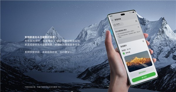 华为畅享70X尊享版支持发送北斗卫星图片消息,长按畅享X键可通过畅连应用发送或接收北斗卫星消息。