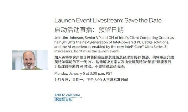 页面显示,发布会将于1月5日下午3:00(太平洋时间)在拉斯维加斯举行,由客户端计算事业部高级副总裁兼总经理Jim Johnson主持。