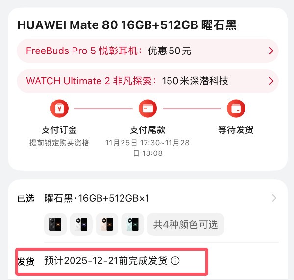 华为商城显示,目前只有Mate 80标准版预计可在今年12月21日前发货。