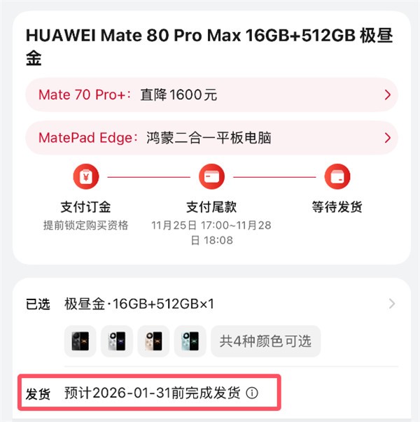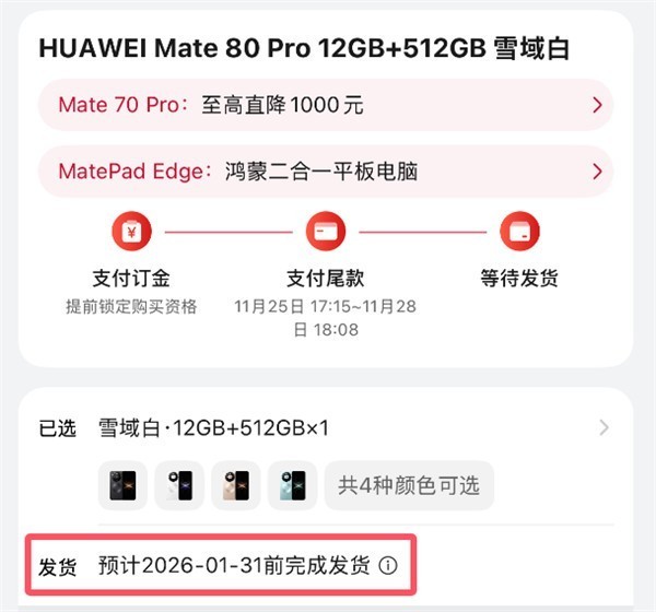 Mate 80 Pro、Mate 80 Pro Max以及Mate 80 RS非凡大师的预计发货时间已经排到了2026年1月31日。