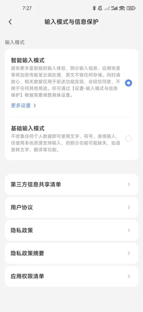 据了解,该输入法拥有智能输入、基础输入两种模式,其中,智能输入会将部分输入信息、应用场景等传输至云端处理。