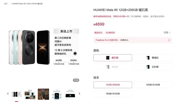 华为商城显示,华为Mate 80系列将于明天正式开卖,起售价是4699元。