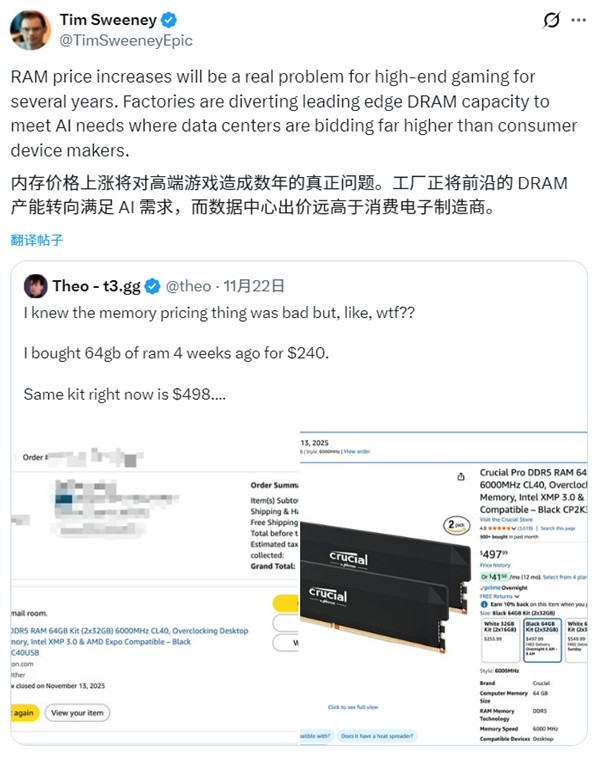 Sweeney的这一观点,是对一位网友的震惊发现所做出的回复,该网友在10月中旬以260美元的价格购买了一套Crucial Pro DDR5-6000内存。