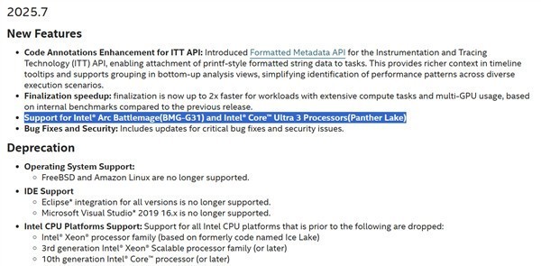 该GPU的名称出现在Intel的性能分析工具VTune Profiler更新日志中,更新日志明确指出,新版本增加了对两款核心硬件的支持:
