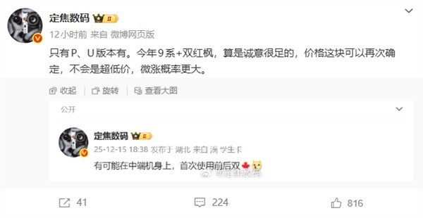 此外,该博主还透露,新机价格可以确定,不会走超低价路线,出现小幅上涨的概率更大。