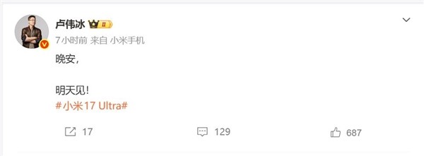 小米集团总裁卢伟冰发微博暗示,小米17 Ultra将在今天正式官宣。此前卢伟冰专门做了一场小米17 Ultra爆料直播,透露了该机的部分细节。