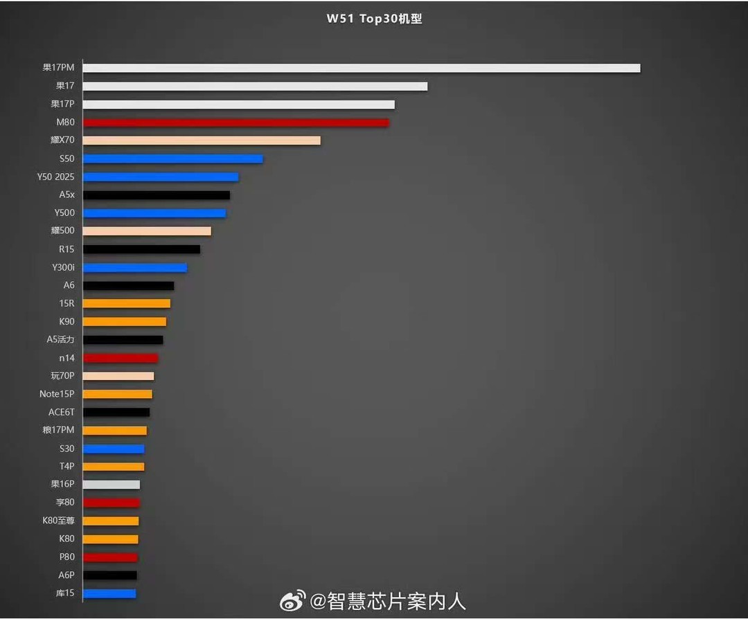 数码博主“智慧芯片案内人”发布2025年第51周手机销量TOP30。