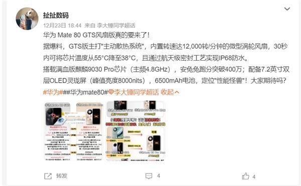 根据其他博主的透露,华为Mate 80 GTS将作为一款定位“性能怪兽”的机型推出,其核心亮点集中在散热与硬件配置上。