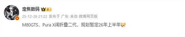 博主“定焦数码”发文表示,华为Mate 80 GTS和Pura X阔折叠屏手机,规划暂定于2026年上半年登场。