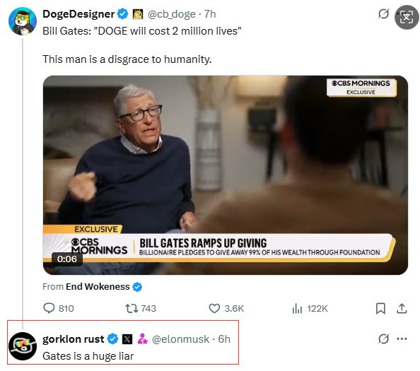 对此,马斯克在X上回复一条关于盖茨采访的帖子时称:“盖茨是个大骗子。”
