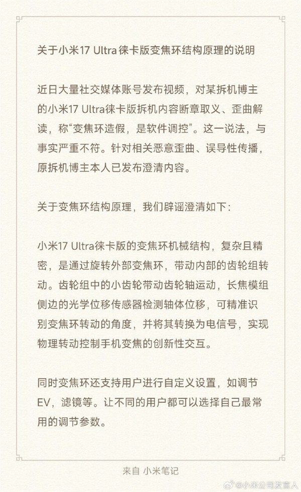 2 别带节奏了!小米回应17 Ultra变焦环 真实物理机械结构:原博主已澄清