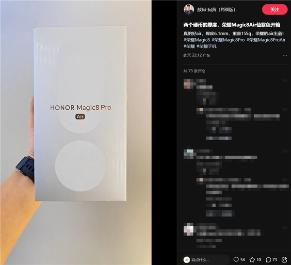 日前,多位荣耀线下门店员工在小红书晒出荣耀Magic8 Pro Air展示样机的真机开箱及上手视频,新机外观细节提前曝光。