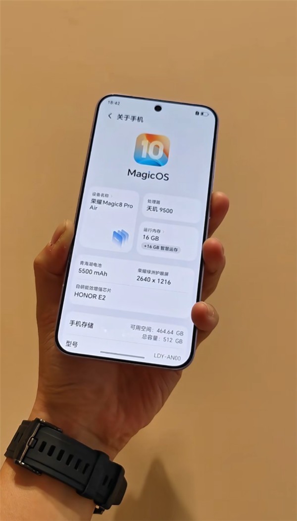 其他配置上,荣耀Magic8 Pro Air正面配备荣耀绿洲护眼屏,分辨率为2640*1216,内置5500mAh青海湖电池,支持80W快充,搭载荣耀E2自研能效增强芯片。