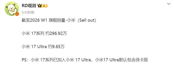 博主“RD观测”发布了2026年第一周的小米旗舰机型销量数据,数据显示小米17系列总销量约达296.92万,小米17 Ultra(默认包含徕卡版)单款销量约9.65万。