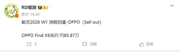 荣耀品牌的旗舰端,荣耀Magic 8系列销量约51.3万,vivo与OPPO的旗舰系列表现同样亮眼,其中vivo X300系列同期销量约109.93万,OPPO Find X9系列截至2026 W1的销量则约85.87万。