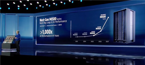 性能方面,MI500系列相比23年发布的MI300系列,AI性能将有1000倍的提升,不过具体怎么提升没有公布,想必是结合了架构、工艺、FP4算子、带宽、机柜规模等因素一起算的。