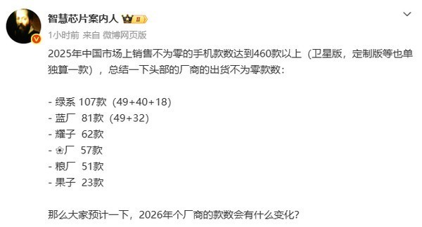 根据第三方市场统计,在标准版、卫星通信版、运营商定制版、联名限定款等各类细分型号均被单独计为一款的统计标准下,2025年中国手机市场在售且销量不为零的机型总数超过460款。