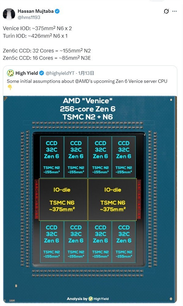 在制程策略上,EPYC Venice的CCD采用台积电2纳米(N2P)制程,以追求极致性能;而负责I/O的IO Die则维持6纳米制程。